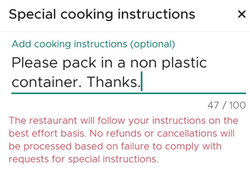 - If you favorite restaurant isn’t thinking about going plastic free, Can you put in your preference , your request in a subtle manner. E.g. if ordering online, Can we give a call to restaurant or place in instructions like below: