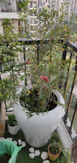 Artificial green grass as flooring. I want at least one tree in my balcony, so bought a huge 3 feet long fiber planter to host a pomegranate tree. This year during the lockdown, it gave fruits as well. Amazing!!
